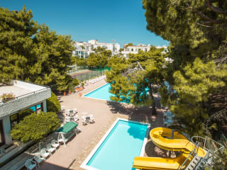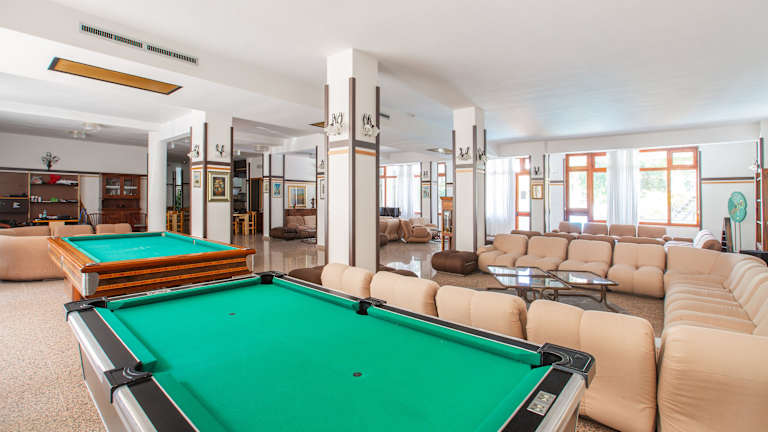 Die Aussenpoolanlage mit einem Kinderbereich eignet sich hervorragend für aktive Erholung und Aquatraining. Der Badebereich bietet Spiel, Spass und Entspannung mit einer Wasserrutsche, einem Whirlpool und Liegestühlen. Für sportlich aktive Gäste steht ein Tennisplatz bereit. Zusätzlich stehen Indoor-Sportmöglichkeiten wie Fitnessstudio, Tischtennis und Billard zur Verfügung. Verschiedene Wellnessangebote wie Spa, Sauna, Dampfbad und Massage-Anwendungen stehen zur Verfügung. Unterhaltung wird im Sommer geboten, ebenso ein Miniclub für die Kleinen.