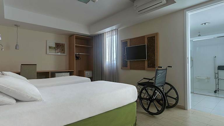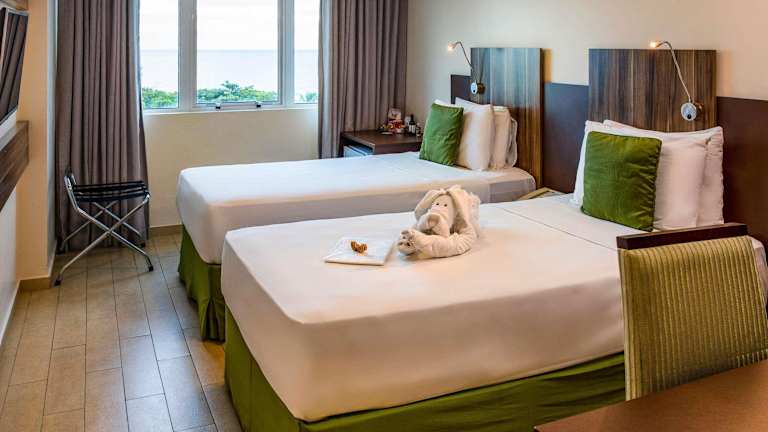 Die Zimmer sind klimatisiert und bieten teilweise Meerblick. Ausgestattet mit einem Doppelbett, zusätzlichem Schlafplatz auf Anfrage, einem Safe, einer Minibar und einem Schreibtisch, bieten sie ein behagliches Ambiente. Zudem stehen ein TV-Gerät mit Satellitenempfang und Wifi (ohne Gebühr) bereit. Die Badezimmer verfügen über eine Dusche und eine Badewanne sowie einen Haartrockner.