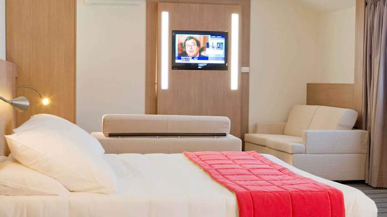 Die Zimmer sind mit Teppichböden ausgestattet und verfügen über ein Doppelbett und ein Sofabett. Zu den Annehmlichkeiten gehören Klimaanlage, Heizung, Safe, Minibar, Schreibtisch, Tee-/Kaffeemaschine, Bügelset, Telefon, TV-Gerät, Radio und kostenloses Wifi. Die Badezimmer sind mit Dusche und Badewanne, Haartrockner und Kosmetikartikeln ausgestattet. Rollstuhlgerechte Zimmer mit barrierefreiem Badezimmer sind ebenfalls buchbar. Es gibt Familien- und Nichtraucherzimmer.
