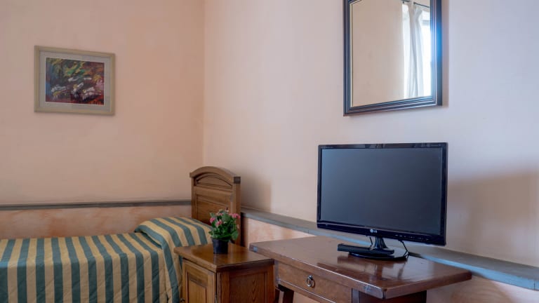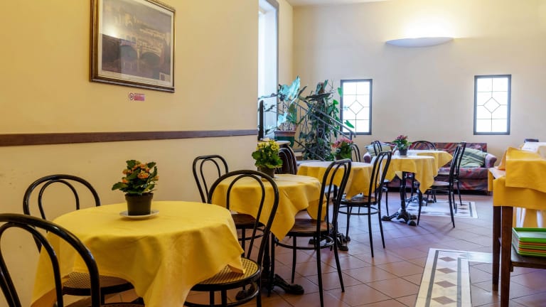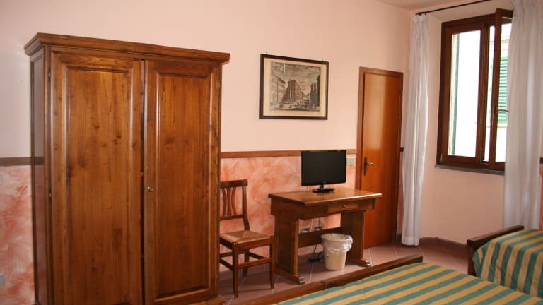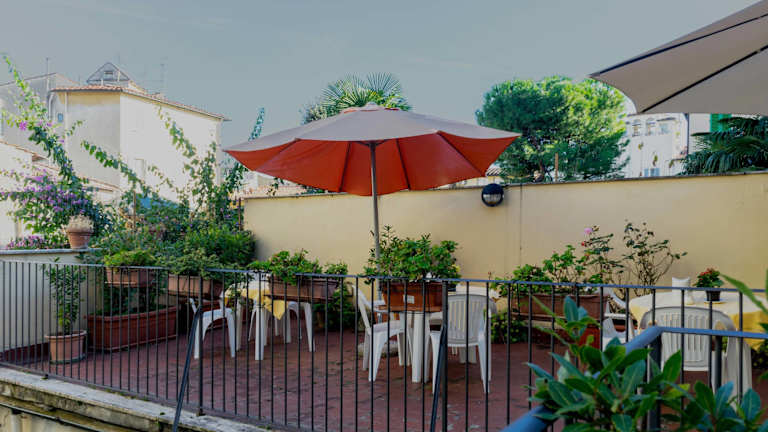 Das historische Hotel Monica bietet eine charmante, florentinische Atmosphäre mit Terrakottaböden und Holzmöbeln. Die gemütliche Terrasse und die ruhigen Gärten laden zum Verweilen ein und sorgen für eine erholsame Umgebung.