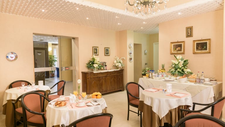 Die gastronomischen Einrichtungen des Hotels umfassen ein Restaurant, ein Café und eine Bar, in denen verschiedene Verpflegungsoptionen wie Halbpension und spezielle Diätgerichte bereitgestellt werden. Ein Frühstücksbuffet mit kontinentalen und italienischen Optionen steht ebenfalls zur Verfügung.