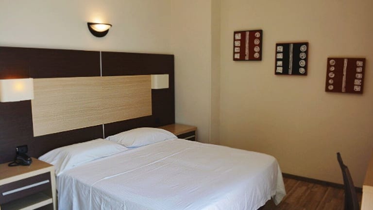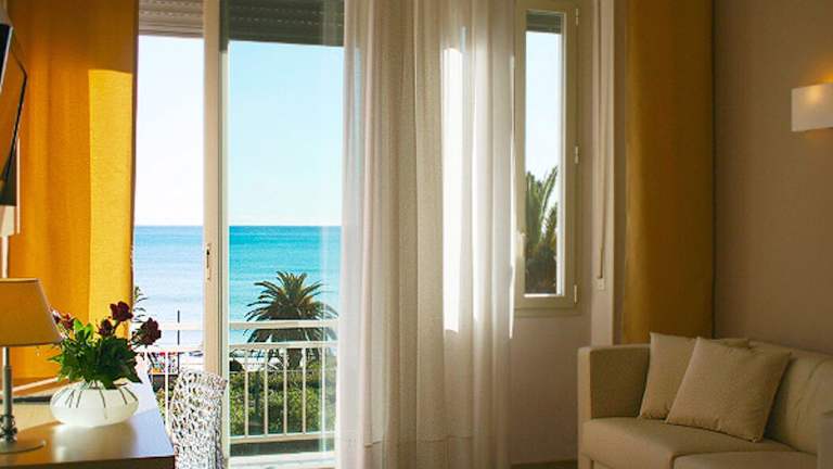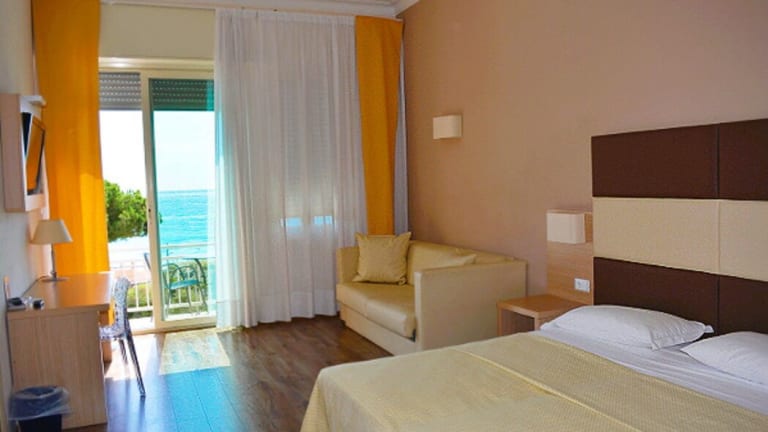 Die Zimmer sind klimatisiert und verfügen über einen Balkon oder eine private Terrasse mit Meerblick. Die Einrichtung umfasst Doppelbetten, Queensize-Betten oder Sofabetten, sowie Schreibtische, Telefone, Sat-TV und gratis Wifi. Die Badezimmer sind mit einer Dusche, einer Badewanne und einem Bidet ausgestattet. Zudem gibt es rollstuhlgerechte Zimmer mit barrierefreien Bädern. Das Hotel bietet sowohl Familien- als auch Nichtraucherzimmer an.
