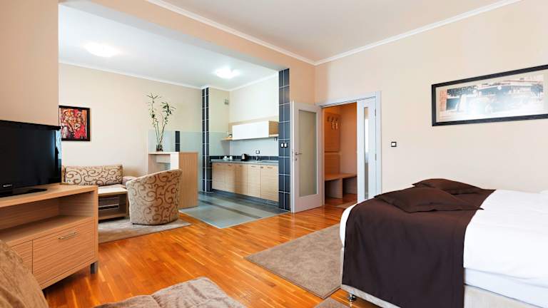 Die Zimmer sind geschmackvoll mit farbenfrohen Dekorelementen und Wandkunstwerken eingerichtet und bieten Annehmlichkeiten wie ein Kingsizebett, ein Sofa oder Schlafsofa, eine Minibar und einen Flachbild-Sat-TV. Zudem verfügen die Zimmer über eine Kochnische mit einer Tee-/Kaffeemaschine, einen Safe sowie ein Badezimmer mit Dusche und Haartrockner. Rollstuhlgerechte Zimmer sind ebenfalls verfügbar. Hausschuhe und ein Bügelset sorgen für zusätzlichen Komfort.