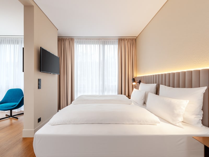 Das Hotel verfügt über 80 Suiten mit getrenntem Wohn- und Schlafbereich, Telefon, Schreibtisch mit Modemanschluss für Fax und PC, W-LAN, Radio, Kabel-TV und vieles mehr.