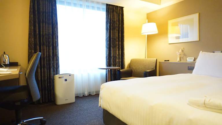 Die Zimmer sind klimatisiert und verfügen über eine moderne Einrichtung mit Teppichböden, einem Doppelbett oder anderen Bettvarianten. Zur Ausstattung gehören ein Safe, eine Minibar, ein Kühlschrank, eine Tee-/Kaffeemaschine, ein TV-Gerät, ein DVD-Player und kostenloses Wifi. Ein helles Bad mit Dusche und Badewanne sowie Haartrockner sind ebenfalls vorhanden. Rollstuhlgerechte Zimmer sind verfügbar.