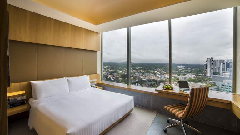 Die klimatisierten Zimmer sind modern eingerichtet und verfügen über ein Doppel- oder Kingsize-Bett. Jedes Zimmer bietet einen Balkon oder eine Terrasse mit Stadtblick. Zur Standardausstattung gehören auch eine Minibar, ein Safe, ein Schreibtisch sowie Kaffee- und Teezubehör. Das eigene Bad ist mit einer Regendusche und zusätzlichen Pflegeprodukten ausgestattet. Hausschuhe stehen ebenfalls zur Verfügung. Für Familien sind spezielle Familienzimmer buchbar.