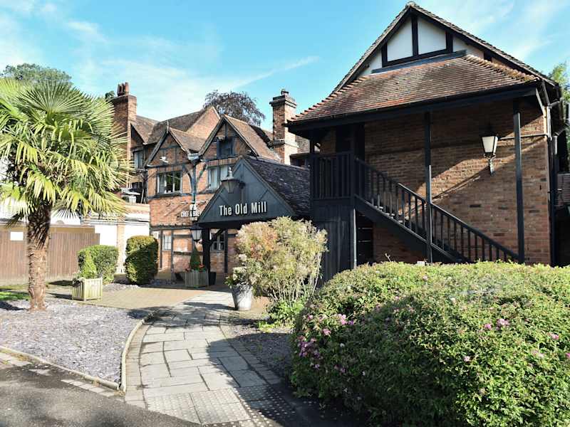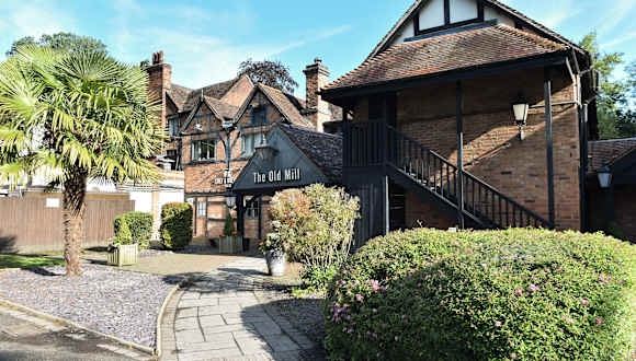 Das Restaurant im Old Mill Inn ist im traditionellen Stil mit Holzbalken und warmen Farbtönen eingerichtet. Es bietet britische Küche sowie eine Auswahl an Weinen und Bieren. Gäste können snacks und Getränke auch auf der Terrasse geniessen.