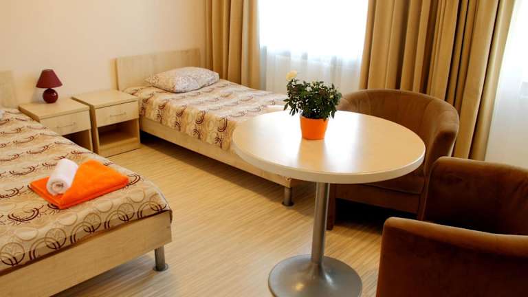 Das Hotel Olimpiska Centra Ventspils befindet sich in unmittelbarer Nähe zur Multifunktionshalle und liegt nur 50 Meter vom Stadtplatz entfernt. Der Busbahnhof ist 700 Meter vom Hotel entfernt, während der Hafen eine Distanz von 1,5 Kilometern hat.