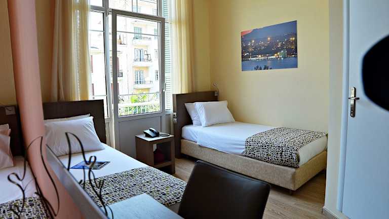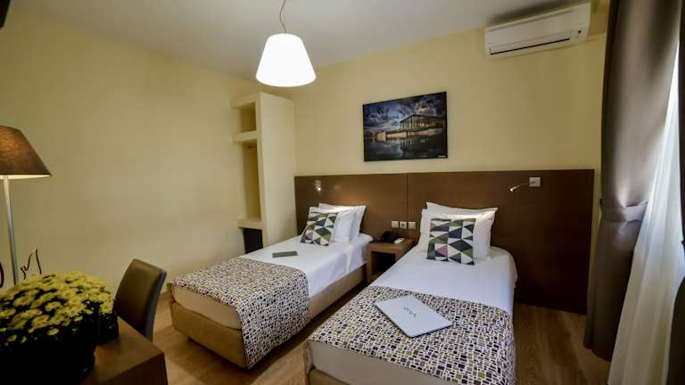 Die Zimmer im Orestias Kastorias sind schlicht und funktional eingerichtet, alle sind klimatisiert und verfügen über eine Minibar sowie Sat-TV. Einige Zimmer bieten Ausblick auf das antike Forum Romanum oder die Demetriosbasilika.