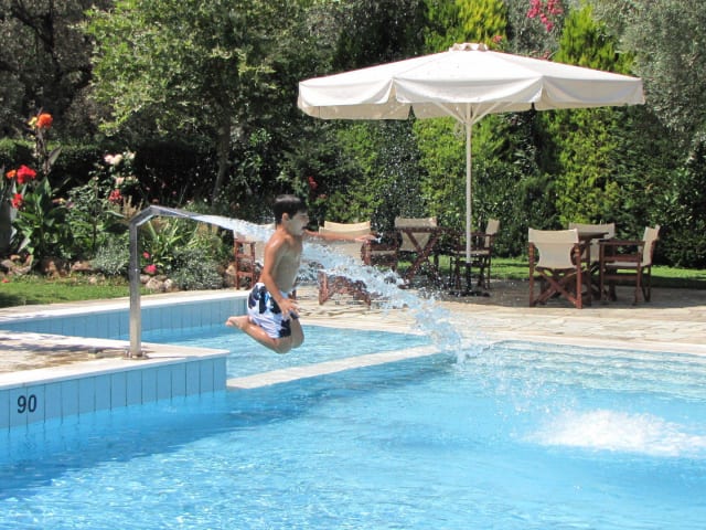 Das Hotel verfügt über: Parking (Kostenlos) Wi-Fi Internet (Kostenlos) Pool mit Kinderbecken Sonnenschirme und Liegestühle am Pool Rezeption Frühstücksraum Frühstücksterrasse Fitness-Raum 9 Doppel- und 3-Bett-Zimmer 1 Familien-Zimmer 2 Zimmer im Erdgeschoß für Rollstuhlfahrer Großer gepflegter Garten mit Gartenmöbeln