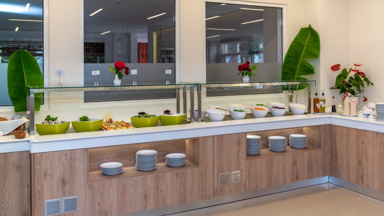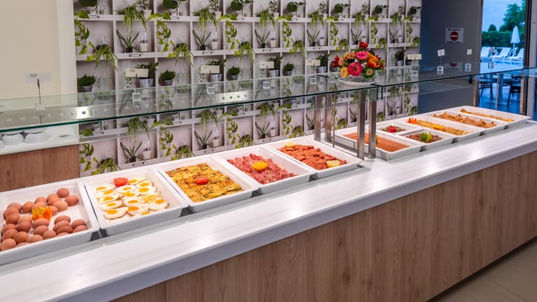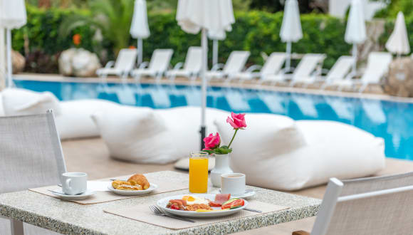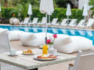 Das Hotel bietet ein reichhaltiges Frühstücksbuffet mit frischen Früchten und griechischem Joghurt. Zum Abendessen werden mediterrane und internationale Gerichte serviert. Genießen Sie erfrischende Cocktails an der Poolbar im Palmengarten.