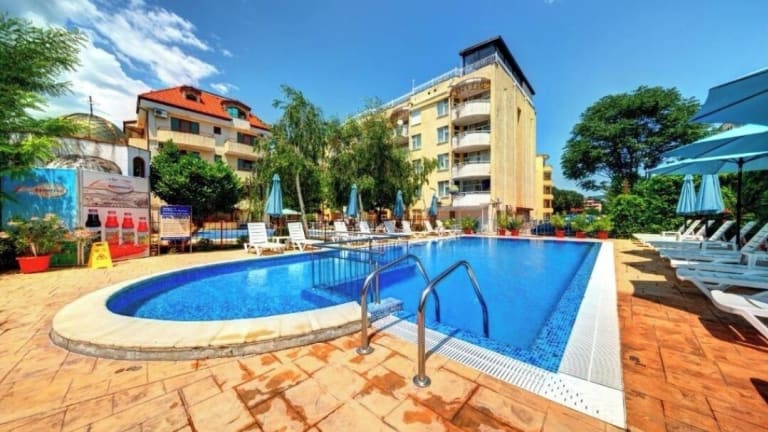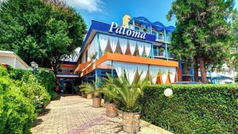 Das Paloma Hotel in Sonnenstrand bietet Ihnen einen angenehmen Aufenthalt mit einem Außenpool und kostenfreiem WLAN in den öffentlichen Bereichen. Die klimatisierten Zimmer sind komfortabel eingerichtet und verfügen über einen Balkon sowie einen Kühlschrank. Das Hotel bietet außerdem eine Bar, eine 24-Stunden-Rezeption und einen Safe. Entspannen Sie auf der Sonnenterrasse und erkunden Sie die nahegelegenen Strände, den Action Aquapark und die Altstadt von Nessebar.