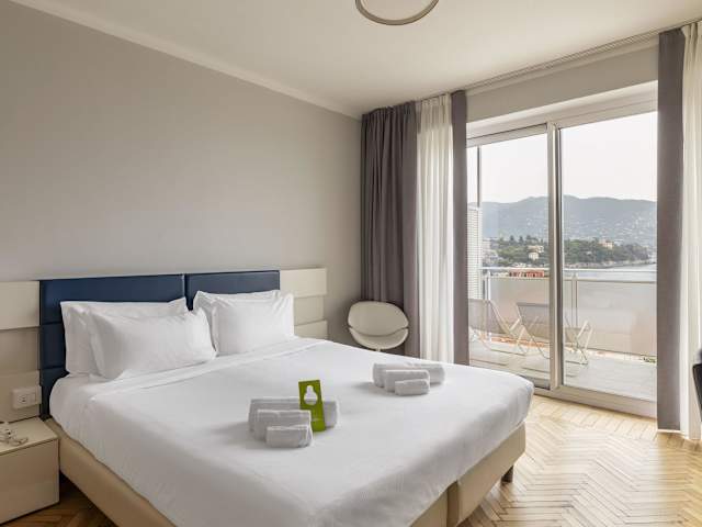 Die Zimmer sind klimatisiert und verfügen über eine individuell steuerbare Heizung. Die meisten Zimmer bieten einen Balkon mit Blick auf das Mittelmeer oder die grüne Landschaft. Zur Ausstattung zählen ein Doppelbett, Internetzugang, Direktwahltelefon und ein TV-Gerät mit Satelliten-/Kabelempfang. Das Badezimmer ist mit einer Dusche und Badewanne, sowie einem Haartrockner ausgestattet. Es stehen 78 Nichtraucher- und Raucherzimmer, sowie rollstuhlgerechte Zimmer zur Verfügung.