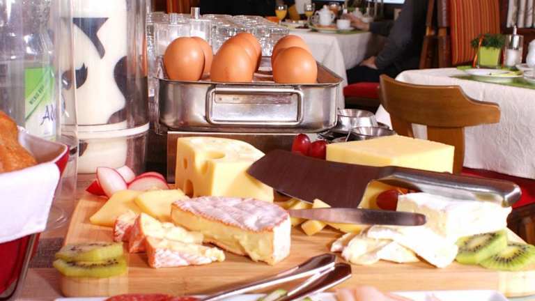 Morgens stärken Sie sich an einem Frühstücksbuffet, das regionale Produkte und hausgemachte Marmeladen umfasst.
