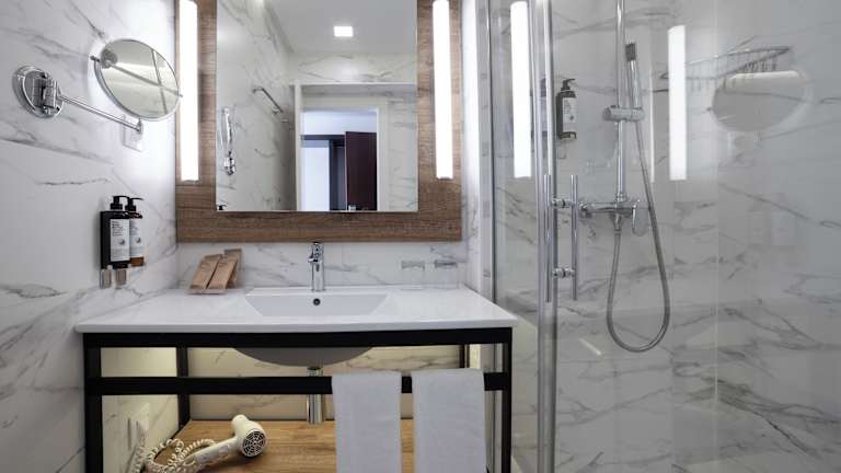 Die Zimmer sind klimatisiert und verfügen über eine individuell regulierbare Heizung. Sie sind mit Teppichböden ausgestattet und bieten eine Terrasse, ein Doppelbett, ein Queensize-Bett oder ein Kingsize-Bett sowie unterschiedliche Annehmlichkeiten wie einen Safe, eine Minibar, einen Schreibtisch, einen Kühlschrank und ein Bügelset. Technische Ausstattung umfasst ein Telefon mit Direktwahl, einen TV mit Satelliten-/Kabelempfang, ein Radio und WiFi (ohne Gebühr). Die Badezimmer sind mit Dusche und Badewanne ausgestattet.