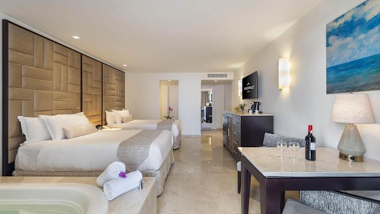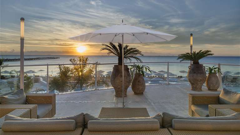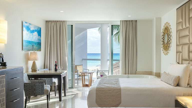 Die Zimmer sind mit Klimaanlage, Heizung und Balkon oder Terrasse mit Meerblick ausgestattet. Sie verfügen über ein Doppelbett, ein Queensize-Bett oder ein Kingsize-Bett, sowie über einen Safe, eine Minibar, einen Kühlschrank, eine Tee-/Kaffeemaschine und ein Bügelset. Unterhaltung bieten ein TV-Gerät mit Satellitenempfang, ein CD- und DVD-Player sowie WiFi. Die Badezimmer sind mit Dusche und Badewanne ausgestattet und es stehen Gästebedarf wie Haartrockner und Bademäntel bereit. Es sind rollstuhlgerechte Zimmer mit barrierefreiem Badezimmer verfügbar.