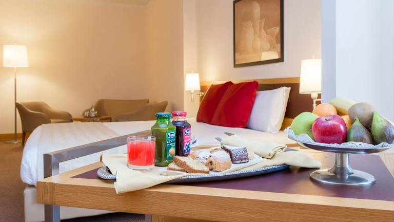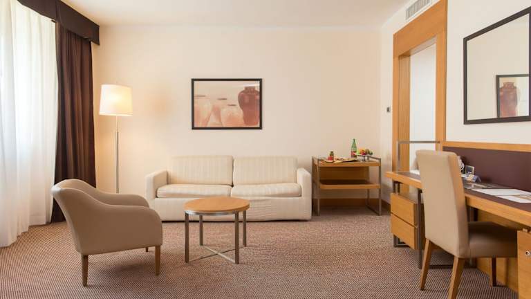 Die Zimmer sind mit Klimaanlage und Heizung ausgestattet und verfügen meist über einen Balkon. Die Ausstattung umfasst ein Doppelbett, ein Sofabett, einen Safe, eine Minibar, einen Schreibtisch sowie eine Tee-/Kaffeemaschine. Alle Zimmer bieten kostenloses Wifi, Sat-TV und ein modernes Badezimmer mit Bademänteln und Haartrockner.