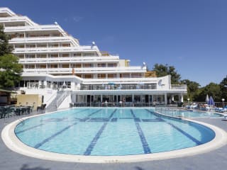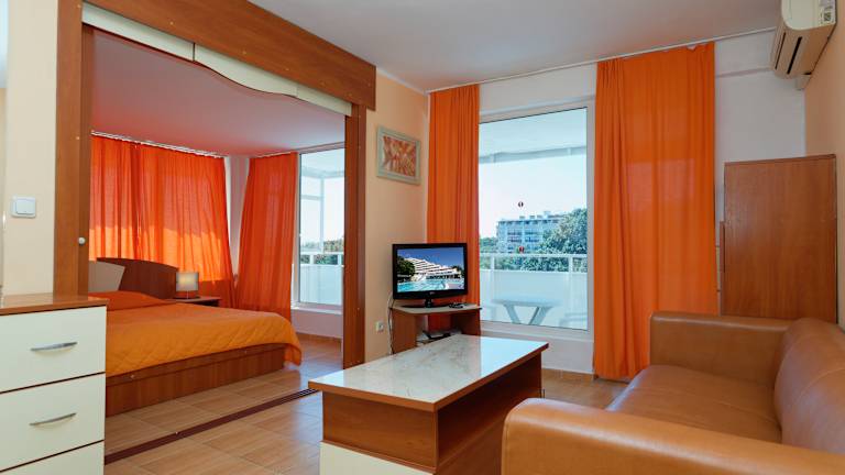 In the center of Golden Sands resort, surrounded by lush greenery rises ten-floor terraced hotel Pliska. The elegant three-star hotel is open all year round and offers excellent conditions for a memorable holiday, wedding celebrations, conferences, seminars, presentations, corporate and sporting events, school camps. The hotel has an attractive outdoor swimming pool, children pool, indoor pool with warm water maintaining temperature of 32-35 ° C, pool bar, massage studio, sauna, fitness studio. The hotel complex welcomes it’s guests in spacious and cool lobby with comfortable seating areas, 24-hour modern reception, where customers can get all necessary information, room service, recreation center, conference hall, laundry, pool, table tennis, foosball, a fitness studio, internet cafe. For greater convenience of the guests the reception offers also: safe deposit box hiring, additional tourist services. In the lobby of the hotel there are 2 stores, where guests can buy beach accessories and cosmetics. At the lobby bar guests can use free wireless internet. The hotel offers 181 double, 12 single rooms and 25 apartments, comfortably furnished with individualy air-conditioned, direct line telephone, refrigerator, TV set and cable TV, all rooms are with balcony, WC and bathroom with shower.