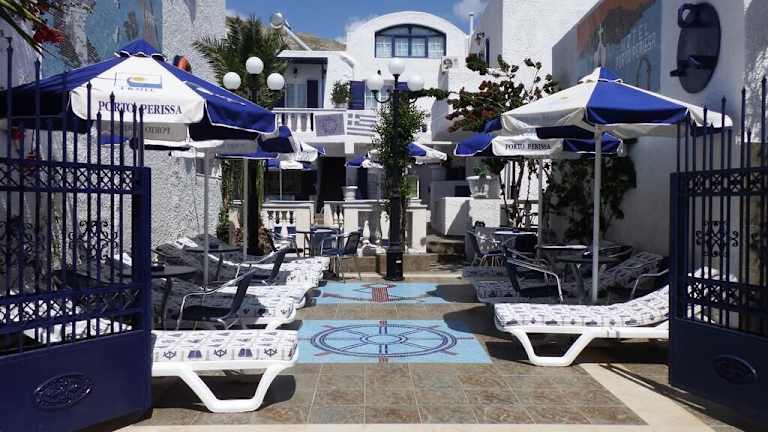 Das Hotel Porto Perissa befindet sich in Perissa, nur 50 Meter vom berühmten schwarzen Sandstrand entfernt. In der Nähe finden sich zahlreiche Restaurants, Bars und Geschäfte. Eine Bushaltestelle und ein Supermarkt sind bequem zu Fuss erreichbar. Fira, die Hauptstadt der Insel, ist nach einer 15-minütigen Fahrt erreichbar.