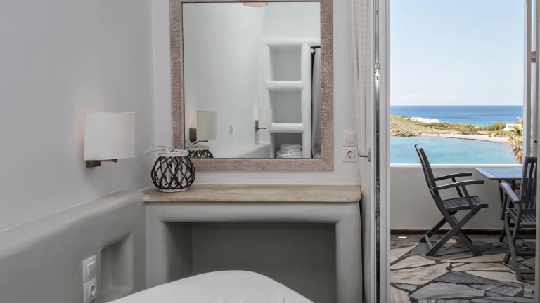 Die Zimmer sind klimatisiert und bieten einen herrlichen Meerblick von Balkon oder Terrasse. Jedes Zimmer ist mit einem Doppelbett, einem Sofabett, einer Kochnische mit Kühlschrank und einem Flachbild-TV ausgestattet. Kostenloses Wifi steht zur Verfügung, und die Badezimmer verfügen über eine Dusche. Für Familien und Nichtraucher sind ebenfalls entsprechende Zimmer buchbar.