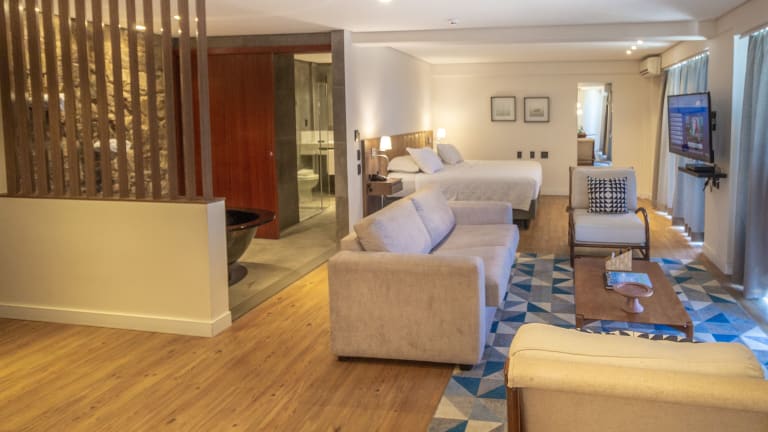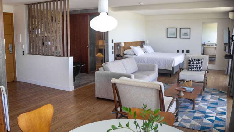Die Zimmer sind mit Klimaanlage ausgestattet und verfügen über einen Balkon oder eine private Terrasse, auf der die Gäste den Blick aufs Meer geniessen können. Die Ausstattung umfasst ein Doppelbett, ein Queensize-Bett oder ein Kingsize-Bett sowie einen Safe, eine Minibar und einen Kühlschrank. Weiterhin stehen ein Telefon, ein TV-Gerät und kostenfreies Wifi zur Verfügung. Die Badezimmer sind mit einer Dusche, einer Badewanne, einem Haartrockner und Kosmetikartikeln ausgestattet.