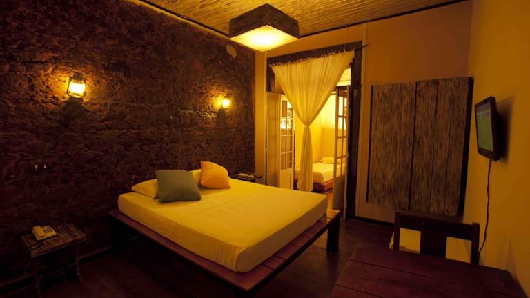 Im Hotel wird ein umfangreiches Buffetfrühstück mit frischem Obst, Bananenpfannkuchen und hausgemachtem Brot sowie Kuchen serviert, das im tropischen Innenhof genossen werden kann. Zudem bietet die hauseigene Pizzeria verschiedene Pizza-Optionen an, und an der Bar können Gäste erfrischende Getränke bestellen.