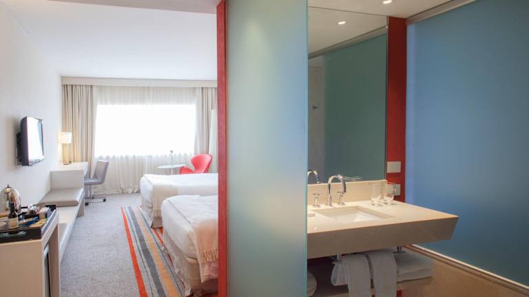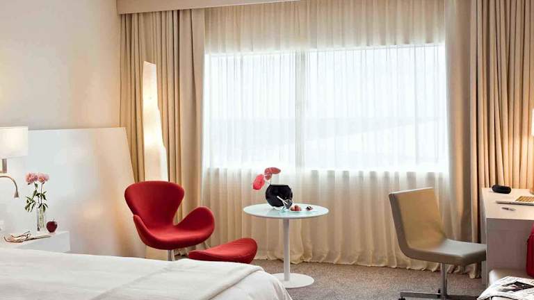 Die Zimmer sind modern eingerichtet und bieten grosse Fenster für viel Tageslicht. Ausgestattet sind sie mit Klimaanlage, Minibar, Safe, Schreibtisch, TV mit Satelliten-/Kabelempfang, Radio und Wifi. Im Badezimmer befinden sich Dusche und Badewanne sowie Kosmetikartikel. Buchbare rollstuhlgerechte Zimmer sind ebenfalls vorhanden.