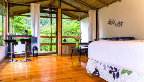 Die stilvollen Bungalows im Hotel Quelitales sind modern eingerichtet und verfügen über Holzböden. Jeder Bungalow bietet eine Wasserfalldusche im Freien, von der aus Sie die herrliche Aussicht auf den Regenwald genießen können. Die Zimmer sind mit einem Schlafsofa, einem Mini-Kühlschrank und einer Kaffeemaschine mit Bio-Kaffee ausgestattet. Einige der Bungalows bieten zudem einen Blick auf den Wasserfall Doña Ana.
