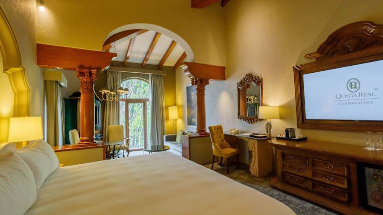 Quinta Real Guadalajara ist ein luxuriöses Hotel mit 76 Zimmern, die sich in einem 3-stöckigen Haupthaus und einem 5-stöckigen Nebengebäude befinden. Das Hotel bietet eine heimelige Atmosphäre mit Möbeln im Antikstil und originalen Kunstwerken sowie efeubewachsenen rosa Steinwänden. Es stehen verschiedene Dienstleistungen zur Verfügung, darunter eine 24-Stunden-rezeption, ein Zimmerservice und ein Business-Center. Der Garten bietet Raum für Entspannung.
