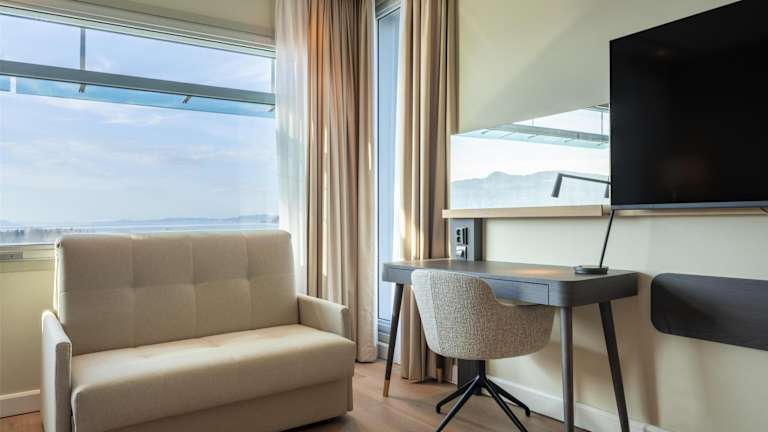 Die Zimmer sind klimatisiert und verfügen über eine Minibar, einen Schreibtisch und eine Tee-/Kaffeemaschine. Zudem sind ein sicherer Safe, ein TV mit Satellitenempfang sowie gratis WLAN vorhanden. Die Badezimmer sind mit einer Dusche und einem Haartrockner ausgestattet und bieten besondere Kosmetikartikel. Rollstuhlgerechte Zimmer sind verfügbar.