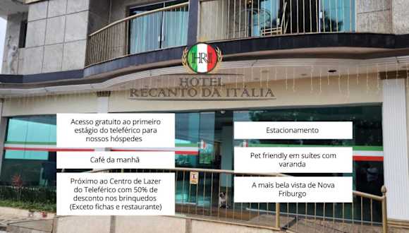 Das Hotel Recanto da Itália bietet Übernachtungsmöglichkeiten mit einer Gemeinschaftslounge und kostenlosem Wifi in der gesamten Unterkunft. Ein kostenloser Privatparkplatz steht den Gästen zur Verfügung, die mit dem Auto anreisen. Das Hotel verfügt über eine rund um die Uhr besetzte Rezeption und bietet eine Nichtraucherunterkunft. Das Ambiente ist geeignet für Familien und bietet eine Vielzahl von Annehmlichkeiten, sowie einen Kinderspielplatz.