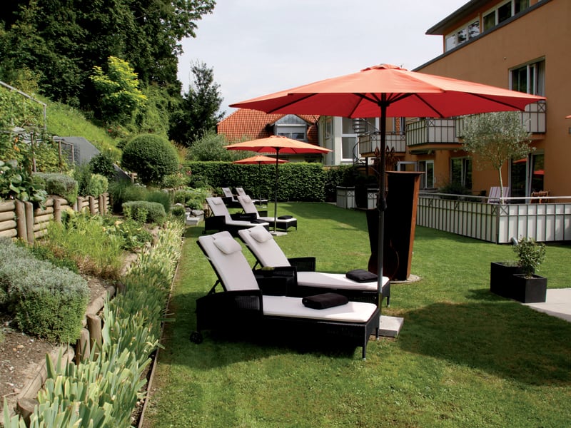 Liegewiese und Loungeecke im Hotelgarten Unterhaltungsmöglichkeiten ca. 5 min zu Fuß entfernt