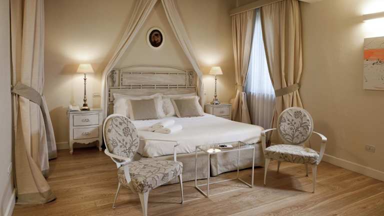 Die eleganten Zimmer verfügen über Holzbalkendecken und Parkett. Einige Zimmer bieten einen eigenen Balkon sowie Möbel aus der Familiensammlung und originale Kunstwerke. Schallisolierte Zimmer sind ebenfalls vorhanden.