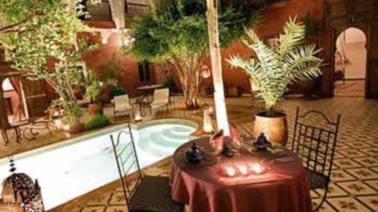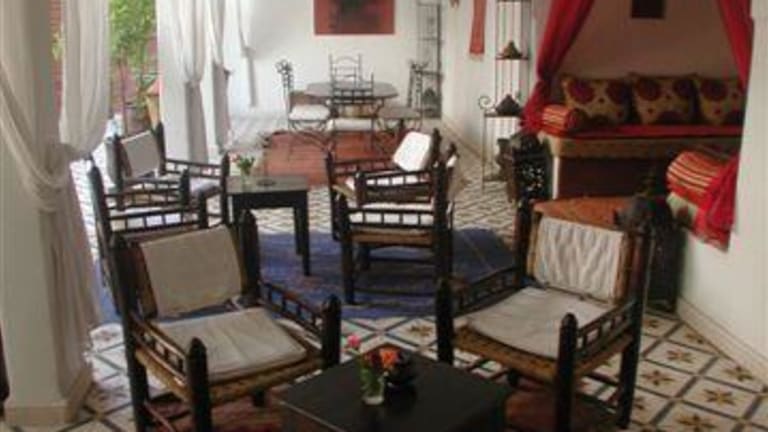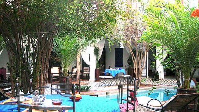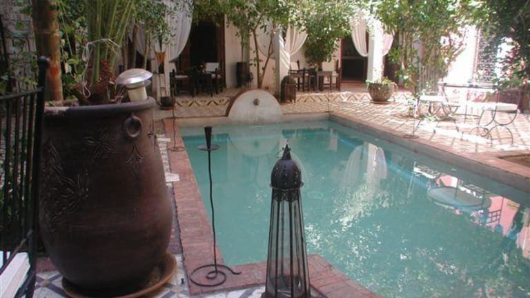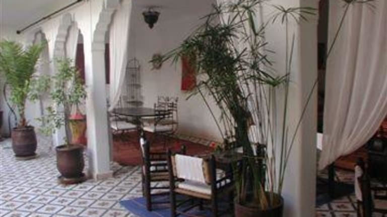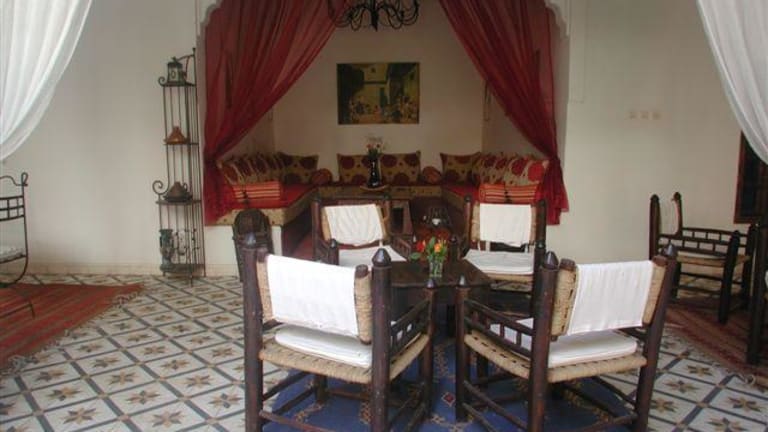 Située prés de la porte de Bab doukkala cette ancienne demeure de charme vous plonge dans la médina pitoresque (souks, place jemaa-elfna, musées), à deux pas du quartier moderne de gueliz (restaurant, bars, pubs et night-clubs). Au fond d’un derb, à l abri de l’agitation des rues, vous êtes accueillis dans ce havre de paix où l’on peut apprécier le doux gazouillis des oiseaux. Au cœur de la médina de Marrakech, passé le seuil de la lourde porte, vous découvrirez avec étonnement une vaste cour fleurie ouverte où citronniers et grenadiers étendent leur frondaison l'été venu. Au centre de ce jardin, un bassin piscine agrémenté de transats bénéficiant d'un ensoleillement exceptionnel s'offre au rafraîchissement et aux bains de soleil. Latéralement et en retrait de cet espace se trouve une grande salle à manger d’été, un petit salon traditionnel appelé Baou et un coin lecture qui seront à votre disposition aux beaux jours et selon vos désirs. Pour les saisons plus fraîches, une salle à manger et un salon aux couleurs chatoyantes vous accueilleront pour un repas traditionnel marocain ou simplement pour y déguster un thé à la menthe et quelques pâtisseries du pays. 3 Chambres se trouvent également à ce niveau On atteint l'étage supérieur en empruntant deux escaliers : L'un accède à une coursive qui dessert trois chambres décorées dans la pure tradition marocaine. Toutes les chambres sont dotées d'une belle salle de bain en Tadelakt, de climatisation et de coffre de sécurité. L'autre nous amène vers une seconde coursive qui elle, dessert le Hammam traditionnel Beldi et la salle de massage et d'esthétique.