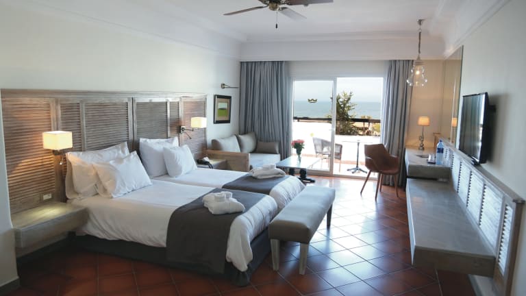 Es stehen Ihnen 254 mit Liebe zum Detail eingerichtete Zimmer (Einzelzimmer, Doppelzimmer, Junior-Suiten) zur Auswahl. ··· Alle Zimmer bieten Bad mit Dusche; sep. WC, Bidet, Bademantel, Toilettenartikel, Kosmetikspiegel, Haartrockner, 220 V, Telefon, WiFi gratis, zentralgesteuerte Klimaanlage/Heizung (je nach Saison), Deckenventilator, kleiner Kühlschrank (keine minibar), Sat-TV, elektronischer Safe, Sitzecke mit Sofa, Balkon oder Terrasse (außer Einzelzimmer), einige sind über den Balkon miteinander verbunden ··· Einzelzimmer: 1 Bett 100x200 cm ··· Doppelzimmer: 2 Betten 100x200 cm, mit Meerblick buchbar ··· Junior-Suiten: 2 Betten 100x200 cm, integrierter Salon mit 2 Sofas, Meerblick