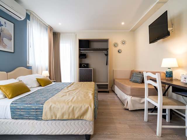 Die Zimmer sind komfortabel und klimatisiert, ausgestattet mit einem Balkon oder einer Terrasse, die einen Blick auf das Meer bieten. Zur Einrichtung zählen ein Doppelbett oder Kingsize-Bett, ein Safe, eine Minibar, ein Schreibtisch und ein Flachbild-TV. Die modernen Badezimmer sind mit einer Dusche und einer Whirlwanne eingerichtet. Zudem stehen für Familien geeignete Zimmer zur Verfügung.