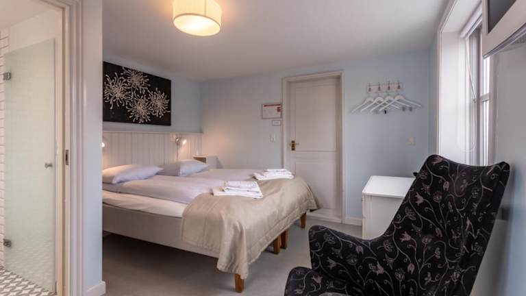 Die Zimmer im Rødvig Kro og Badehotel sind gemütlich und in frischen Farbtönen gestaltet. Sie bieten entweder ein eigenes Bad oder ein Gemeinschaftsbad. Die Einrichtung kombiniert traditionelle und moderne Designideen und sorgt für eine angenehme Atmosphäre. Die meisten Zimmer bieten zudem einen herrlichen Blick auf die Fakse-Bucht und Stevns Klint. Zur Ausstattung gehören eine Sitzecke, ein Flachbild-TV und ein Schreibtisch. Einige Badezimmer verfügen über eine Dusche.