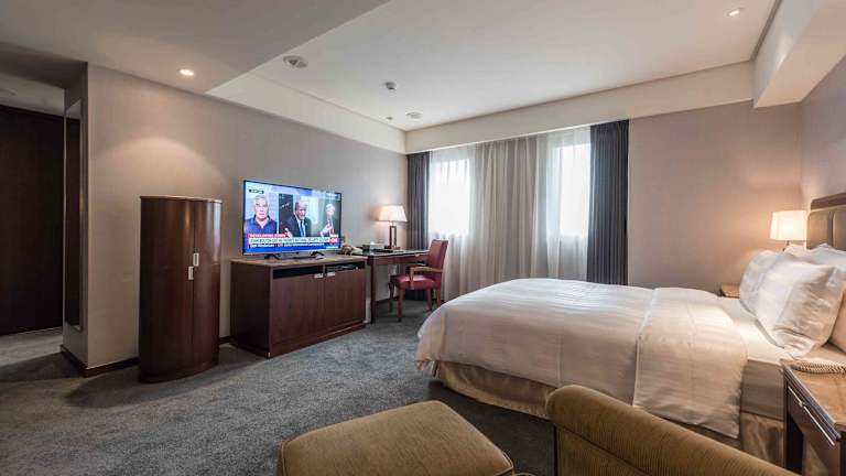 Die Zimmer bieten ein angenehmes Raumklima durch Klimaanlage und Heizung. Sie sind mit einem Doppelbett, einer Minibar, einem Schreibtisch, einem Kühlschrank, einem TV-Gerät, einem DVD-Player sowie WiFi ausgestattet. Im Badezimmer stehen eine Dusche, eine Badewanne, Haartrockner und Bademäntel zur Verfügung. Zudem gibt es Nichtraucherzimmer.