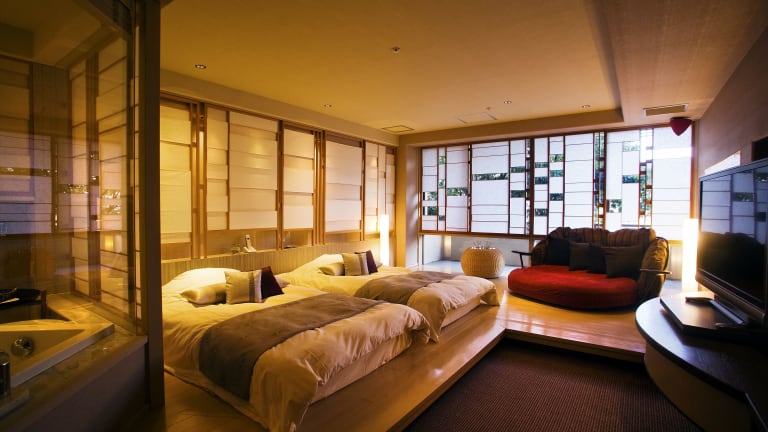 Die Zimmer im Ryokan sind mit einem Doppelbett ausgestattet und verfügen über separate Schlafzimmer. Zur komfortablen Ausstattung gehören eine Klimaanlage, Heizung, ein Kühlschrank sowie Kommunikationsmöglichkeiten durch ein Telefon und einen Fernseher. WLAN ist in den Zimmern ohne Gebühr verfügbar. Die Badezimmer sind mit Duschen ausgestattet, und die Gäste erfreuen sich an Kosmetikartikeln. Es gibt sowohl Nichtraucherzimmer als auch Familienzimmer.