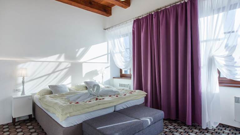 Die Unterkünfte im Hotel Salety verfügen alle über ein eigenes Bad mit einem Haartrockner, Sat-TV und einen Kühlschrank. Die Suiten bieten zusätzlich einen Sitzbereich, während einige Zimmer einen Blick auf das Schloss gewähren.
