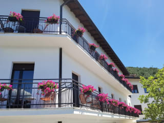 Alle Doppelzimmer haben Seeblick. Die zwie Einzelzimmer haben Bergblick. Fast alle Zimmer sind mit Klimaanlage und Balkon.