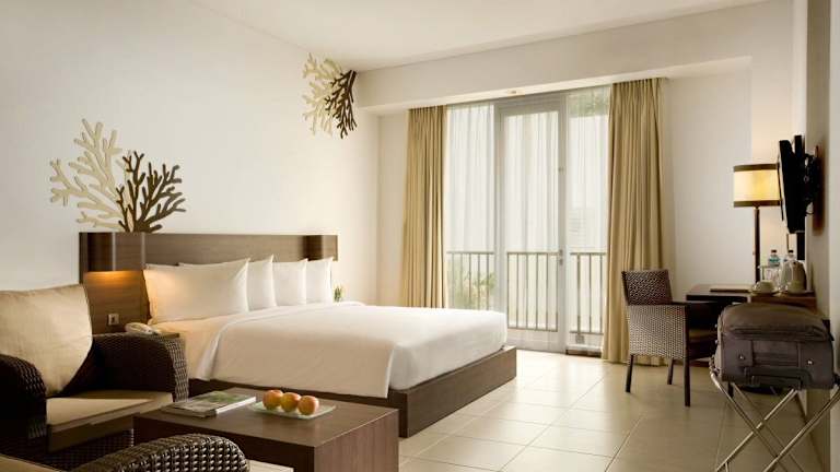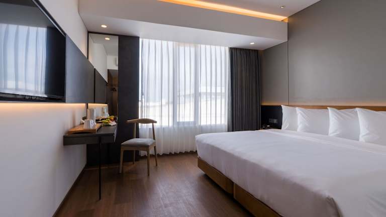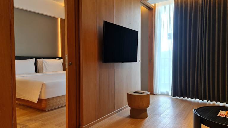 Die Zimmer sind klimatisiert und verfügen über raumhohe Fenster, einen Balkon, einen Safe und ein eigenes Badezimmer mit Warmwasserdusche. Zur Ausstattung gehören ein Kingsizebett, ein Sofabett, ein Kühlschrank, eine Tee-/Kaffeemaschine, ein TV-Gerät mit Satellitenempfang und kostenloses Wifi. Hausschuhe und Kosmetikartikel sind ebenfalls vorhanden.
