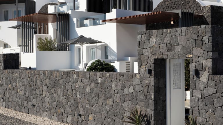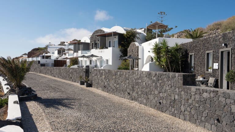 Imerovigli, in der Nähe der lebhaften Stadt Fira. Der Flughafen von Santorini ist 10 km entfernt, und zur Erkundung der Umgebung stehen Transfers an.