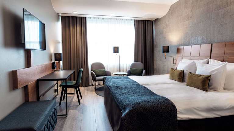 Die klimatisierten Zimmer verfügen über Holzböden, ein Queensizebett, ein Sofabett und können mit einem Zustellbett ausgestattet werden. Zur Zimmereinrichtung gehören ein Schreibtisch, eine Minibar, ein Safe, ein TV-Gerät, Radio und ein Direktwahltelefon. In den Badezimmern sind ein Haartrockner und Kosmetikartikel vorhanden. Teilweise sind auch rollstuhlgerechte Zimmer verfügbar.