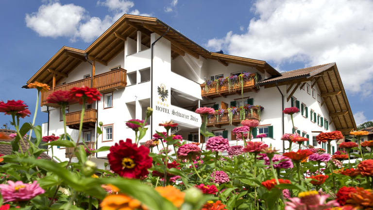 Das 4-Sterne Hotel Schwarzer Adler, dessen Ursprünge auf das 14 Jhd. zurückgehen, zählt zu den ältesten Gasthäusern Tirols. Es liegt im Zentrum von Seis, nur 1 km von der Panoramabahn zur Seiser Alm, der größten Hochalm Europas, entfernt. Dieses Hotel gehört zu den mit „sehr gut“ bewerteten Häusern in Italien. Es hat das Qualitätssiegel HolidayCheck Quality Selection im Jahr 2014 verliehen bekommen. Seis liegt auf 1000 m ü.d.M. in einer sonnigen Höhenmulde zu Füßen des Schlerns und seiner imposanten Santnerspitze, umgeben von saftigen Wiesen, mächtigen Wäldern, kühnen Bergspitzen, geheimnisvollen Ruinen und malerischen Kirchlein. Den Golfplatz St. Vigil Seis erreichen Sie einfach und bequem in 5 Minuten. Nach mehrmaligem Wechsel ging das Hotel 1986 in den Besitz unserer Familie über, und mit dem Umbau 1996 ist moderner Komfort in die alten Gemäuer eingezogen. Dennoch ist es uns gelungen, die ursprüngliche Harmonie von Mauern und Gewölben und die Wärme und Behaglichkeit der alten Stuben zu erhalten. Der erhalten gebliebene zweigeschossige Keller mit gestampftem Erdboden birgt edle Weine und Schnäpse, sowie Eingelegtes zur Weiterverarbeitung in erlesene Speisen und Spezialitäten der Südtiroler und italienischen Küche. Das zuletzt 2020 renovierte Hotel verfügt über komfortabel eingerichtete Zimmer und Suiten sowie zwei Apartments, einen Wintergarten mit herrlichem Blick auf den Schlern und die Santnerspitze zum Loungen und Relaxen, eine Panorama-Dachterrasse mit fantastischem Rundumblick zum Sonnen und Genießen, ein neues Hallenschwimmbad mit Liegewiese sowie einen eigenen Wellnessbereich mit Sauna, Dampfbad, Infrarot-Kabine und schönem Ruheraum. Massagen und Schönheitspflege werden ebenfalls angeboten.