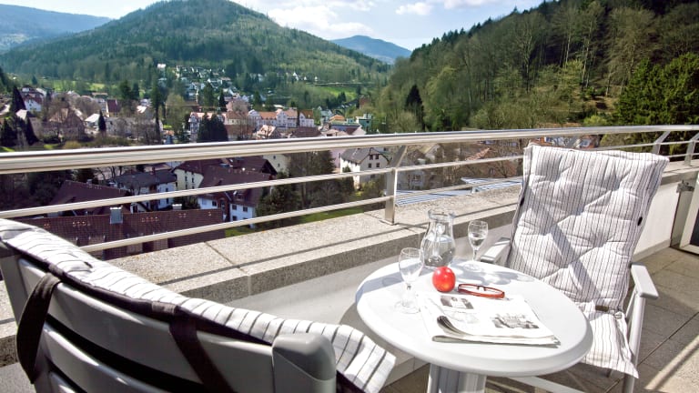 Erblicken Sie von hier aus das faszinierende Panorama über die Jahrhunderte alte Kurstadt Bad Herrenalb bis hin über die Berglandschaft des Schwarzwaldes.
