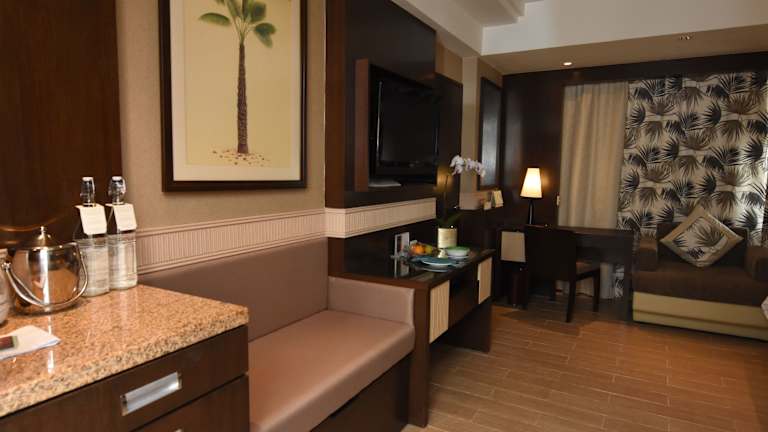 Im Café werden internationale Buffets angeboten, die mit einem Ausblick auf den tropischen Garten genossen werden können. Weitere gastronomische Angebote sind nicht näher beschrieben.