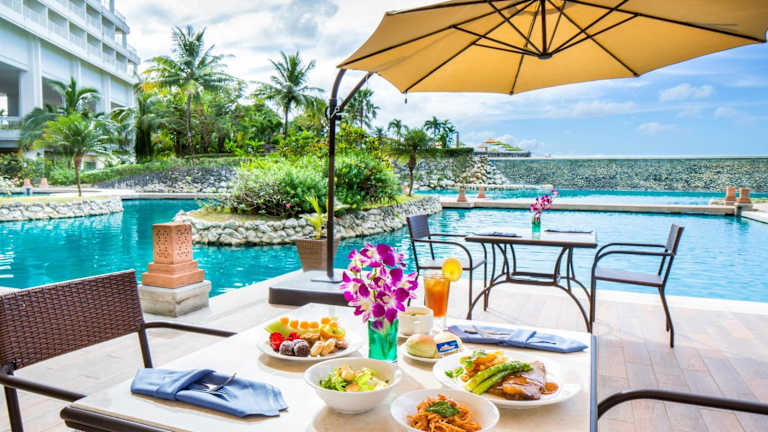 Das Angebot an Verpflegungsmöglichkeiten umfasst internationale, japanische, amerikanische und lokale Küche. Die Point Lounge Bar bietet einen Ausblick auf die Lagune, den Infinity-Pool und den Ozean. Des Weiteren steht ein 24-Stunden-Zimmerservice zur Verfügung.