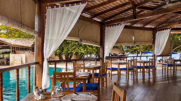 Im Hotel steht den Gästen ein klimatisiertes Restaurant mit Meerblick zur Verfügung, das eine abwechslungsreiche Küche aus indonesischen, asiatischen, italienischen und internationalen Gerichten bietet. Es sind verschiedene Verpflegungsangebote buchbar, darunter Übernachtung mit Frühstück und Vollpension. Neben Frühstück werden Mittag- und Abendessen à la carte angeboten, und auf Wunsch sind Diätgerichte sowie Kindermenüs erhältlich.