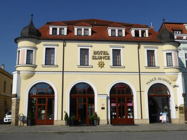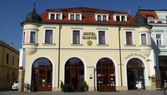 Das Hotel Slunce liegt im Herzen von Uherské Hradiště und ist in einem beeindruckenden Renaissance-Gebäude untergebracht. Die zentrale Lage ermöglicht es den Gästen, bequem zu Fuß die zahlreichen Sehenswürdigkeiten und Geschäfte der Stadt zu erkunden. Der Bahnhof befindet sich nur etwa 300 Meter vom Hotel entfernt, was es auch zu einer praktischen Wahl für Reisende macht, die mit öffentlichen Verkehrsmitteln anreisen.